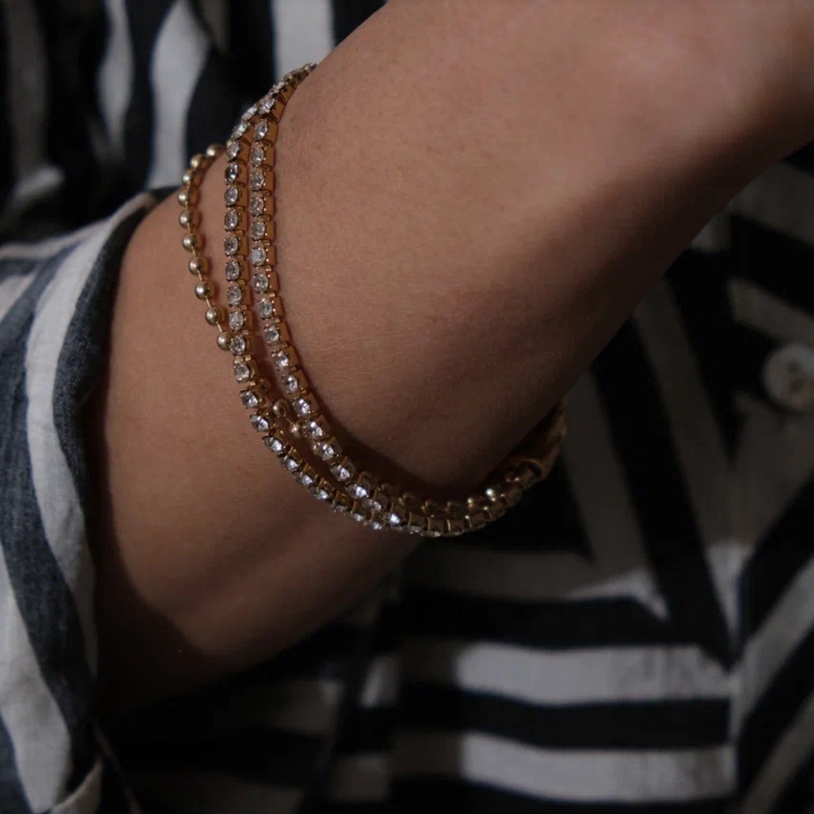 Выполнен в три ряда из ювелирного сплава с покрытием серебром, удобный замок - карабин, вставка - кристаллы.