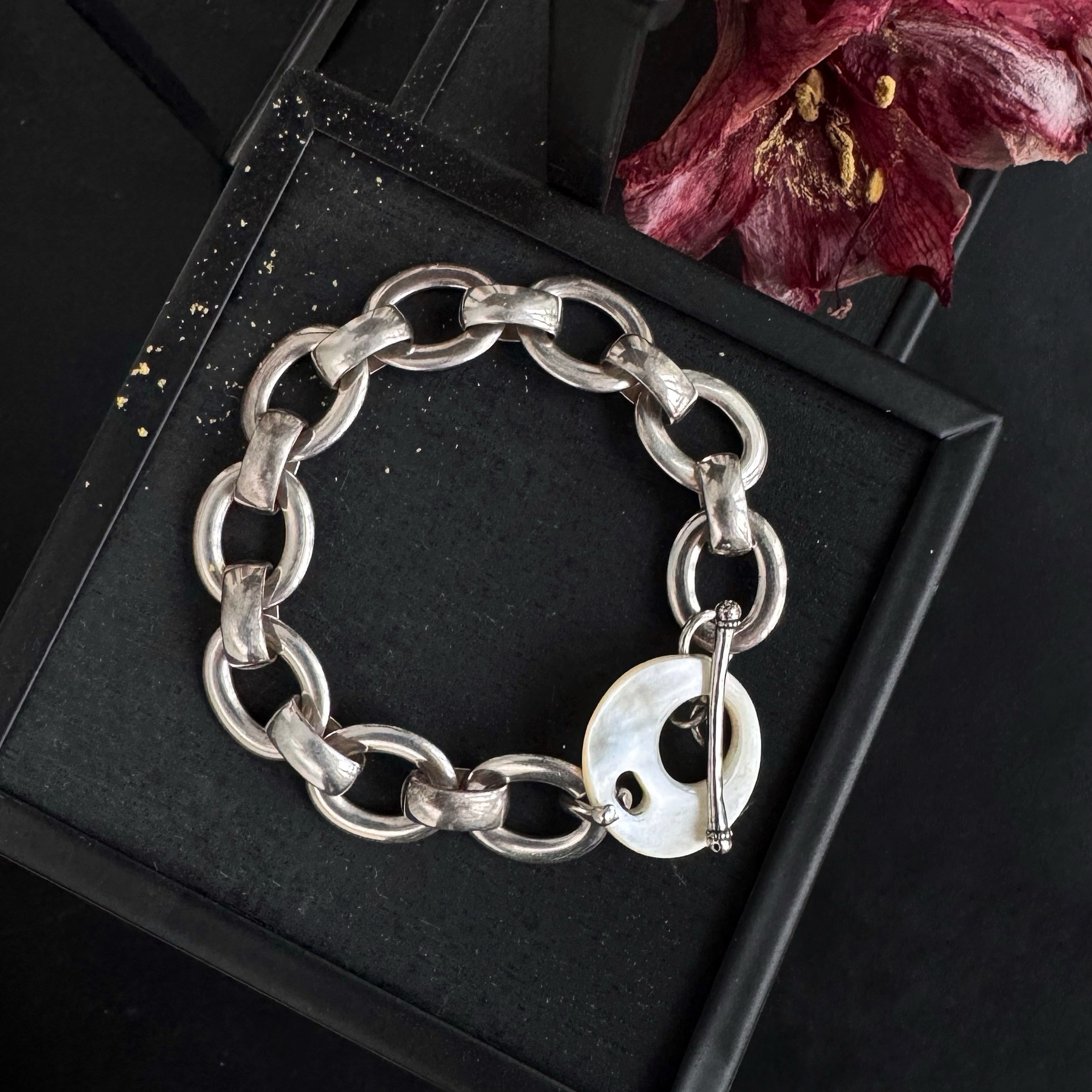 Ювелирный сплав на основе латуни и олова  с покрытием серебром, застежка-тогл выполнена из перламутра