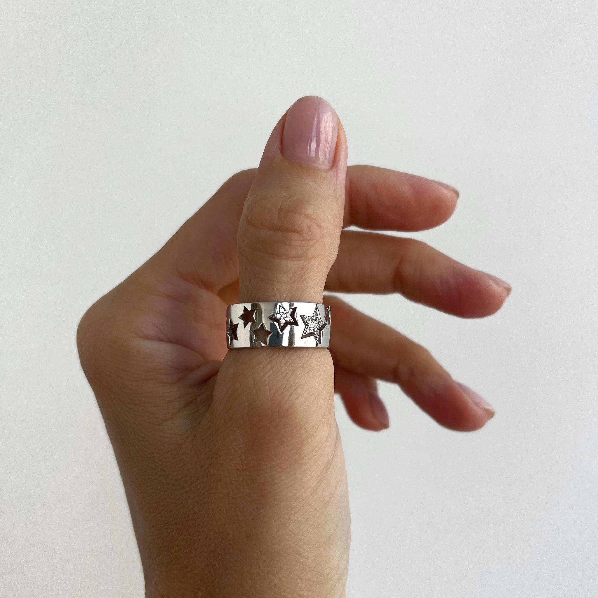 Кольцо широкое с вставками из фианитов в виде звёзд, в размере 15,5 мм (можно на фалангу).