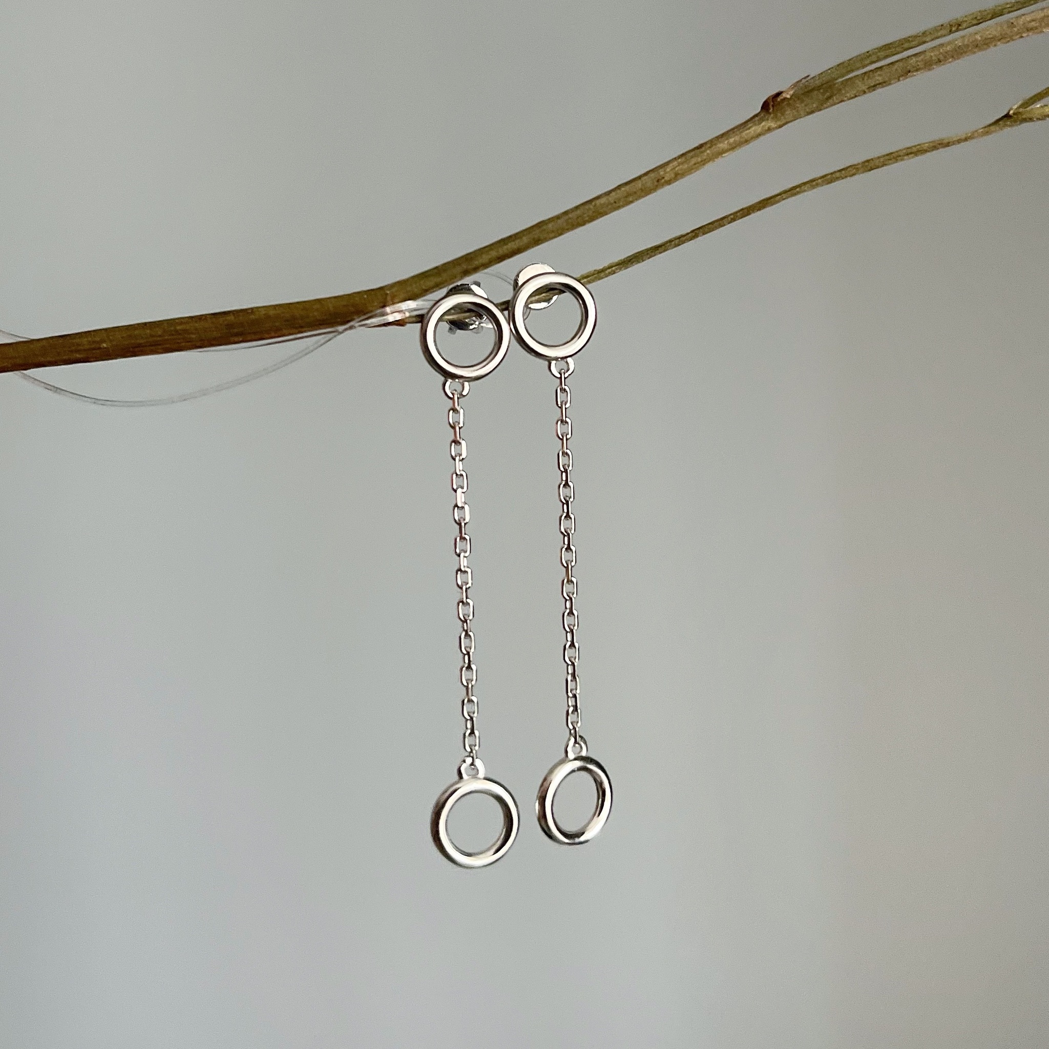 Серьги в виде двух кружочков на цепочке, длиной 4,5 см, круг 0,7  см,  выполнены из серебра 925 пробы, вес-1,54 гр.