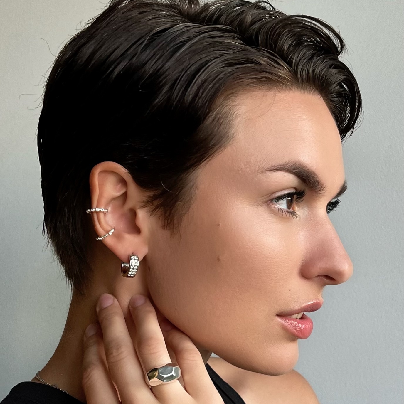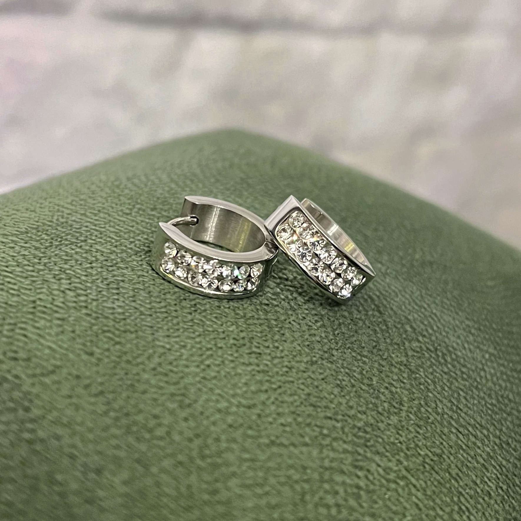 Серьги-кольца марки Arts&Crafts с двойной дорожкой кристаллов, выполнены из ювелирного сплава с покрытием серебром, застежка - английский замок.