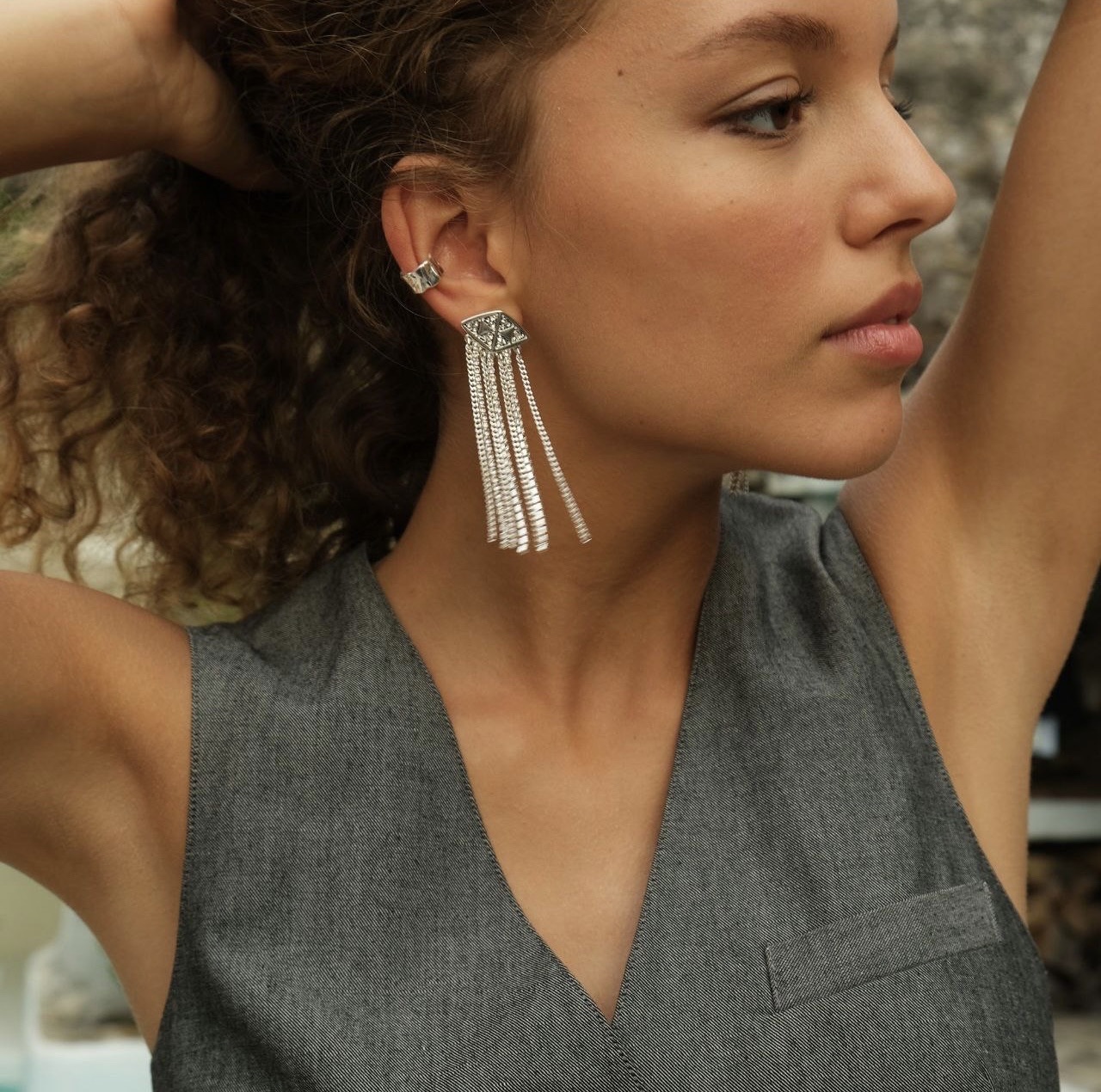 Серьги выполнены из ювелирного сплава с гальваническим покрытием серебром, размер ромб 1*1 *2,2 см, длина - 8 см