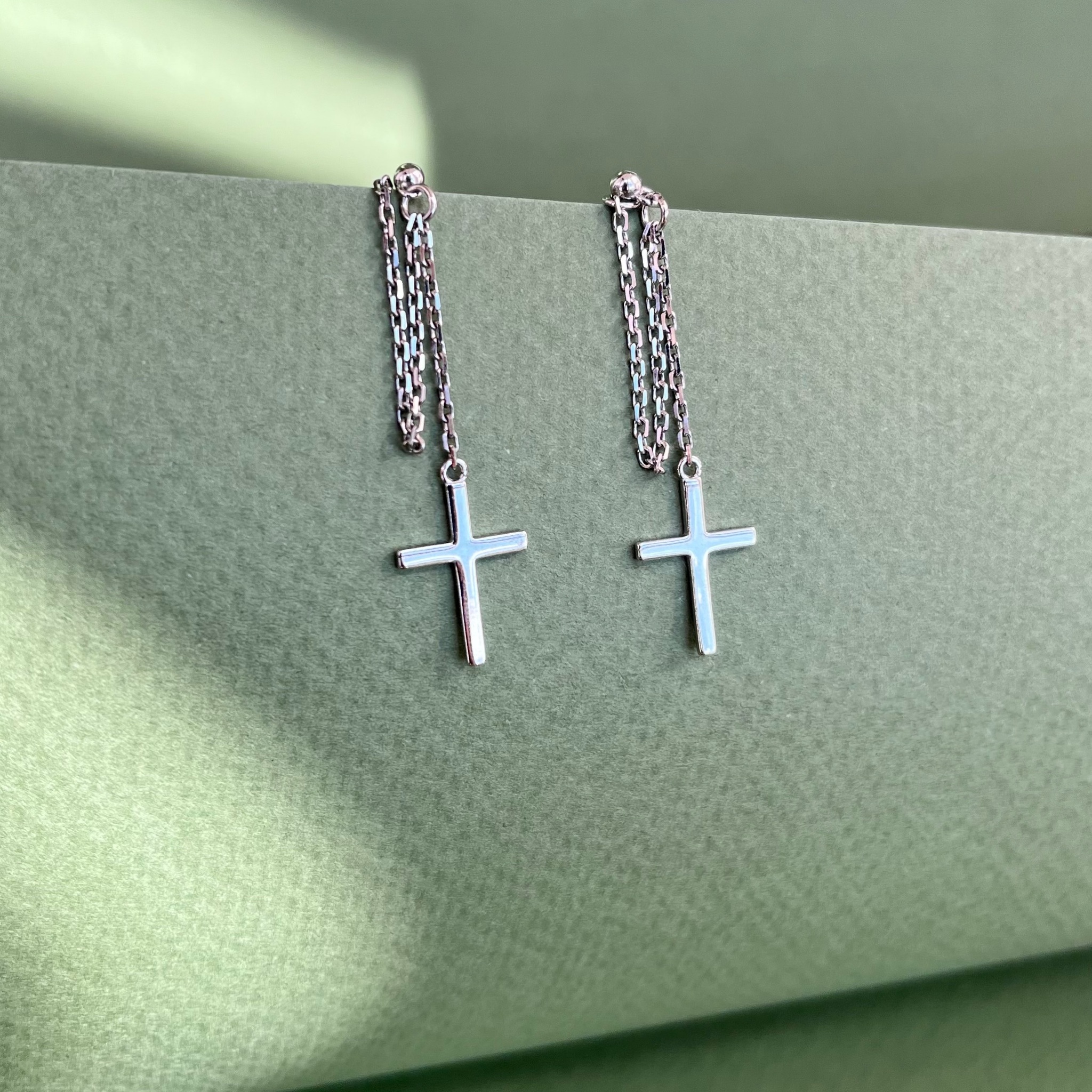 Серьги в форме креста с подвесами в виде цепей, размер 3,8 см (сам крест 1,4х0,9 см) выполнены из серебра 925 пробы, вес-2,7 гр.