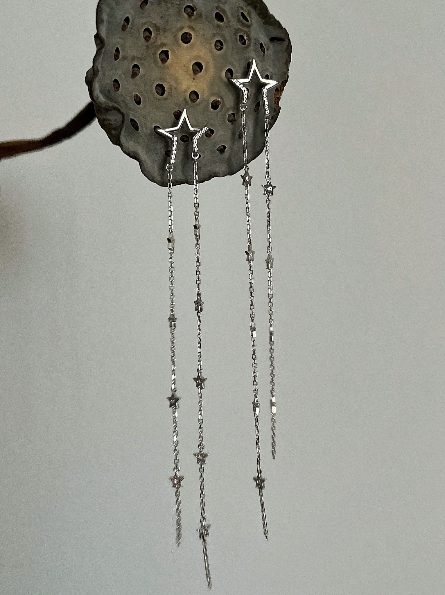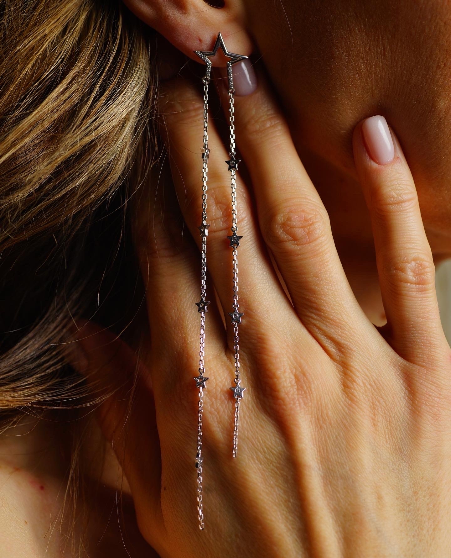 Серьги со звездой и цепями, размер 0,5х0,5х12,0 см, выполнены из серебра 925 пробы, вес-5 гр., вставки из фианитов