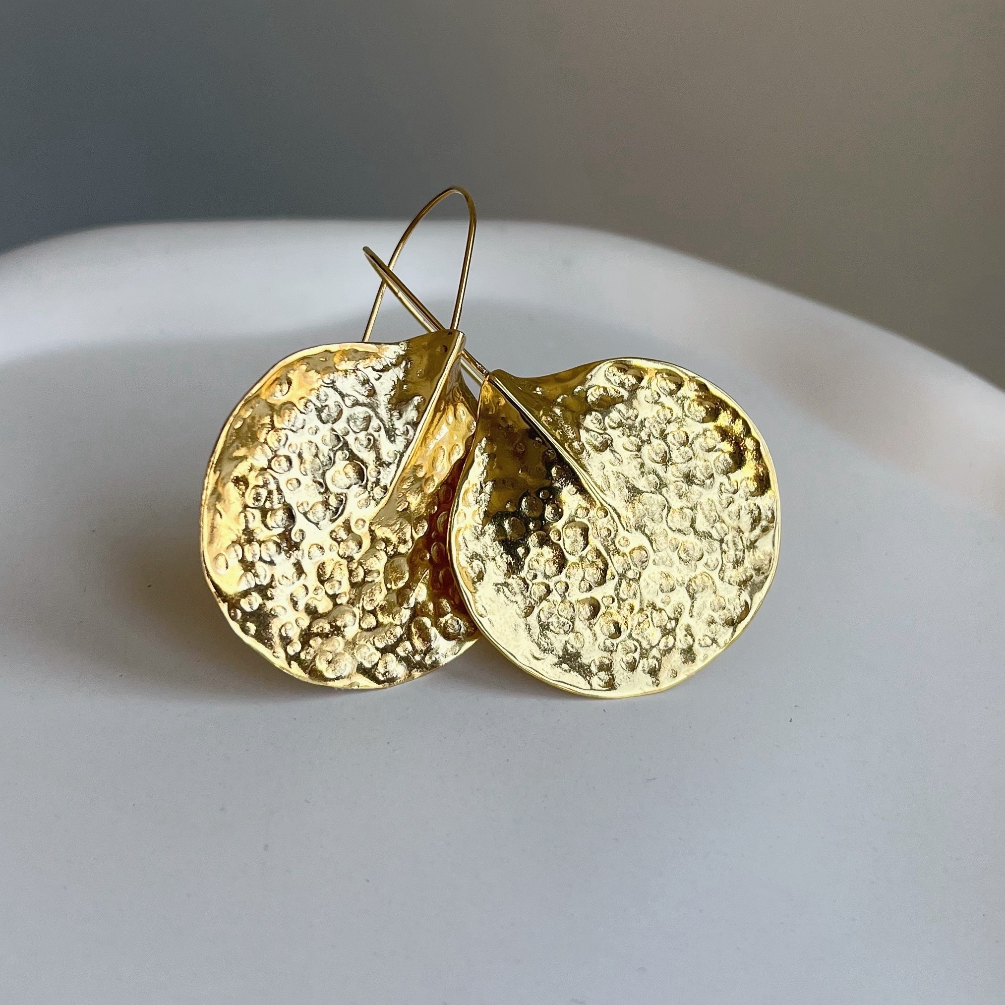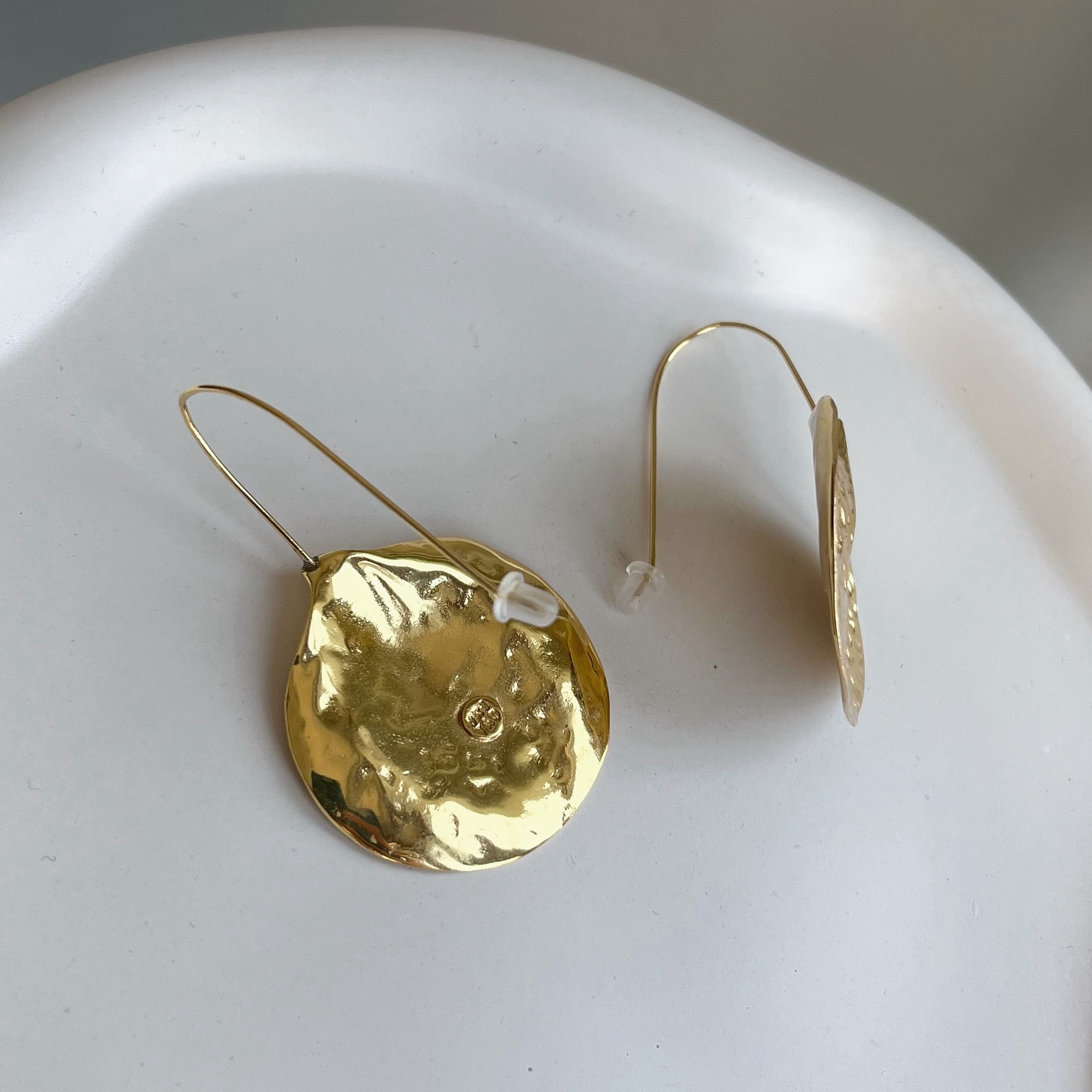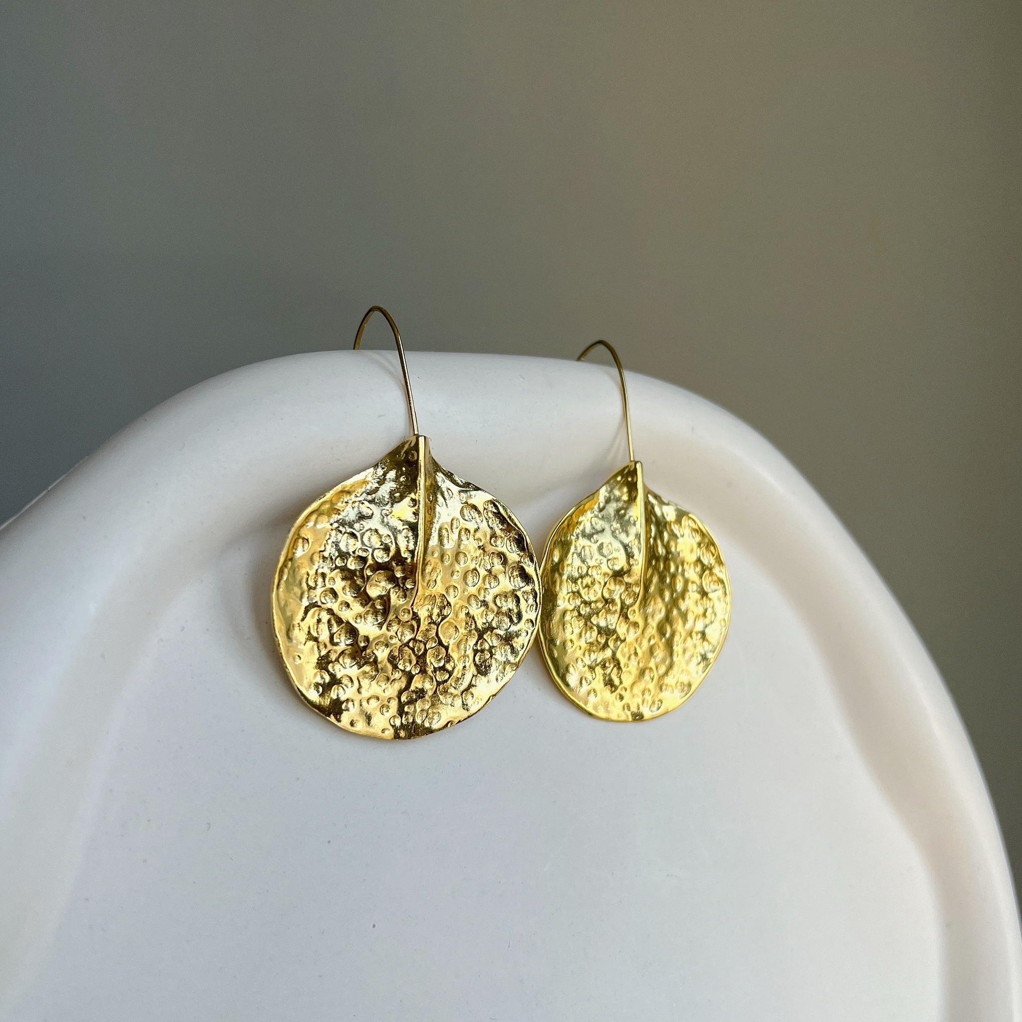 Серьги в виде больших фактурных лепестков Petales от французского бренда ORI TAO золотой металл, длинная швенза, диаметр - 3,50, полная длина - 5,50 см.